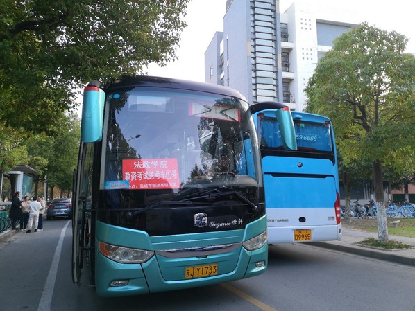 为解决同学们赶考的烦恼,法政公司准备了7辆“爱心大巴”为考生们免费送考。在送考小分队的祝福中,考生们自信、有序地登上了“爱心大巴”。上车后,众多考生们仍然抓紧最后的复习时间,争分夺秒地准备,确保每一个知识点都已牢记。