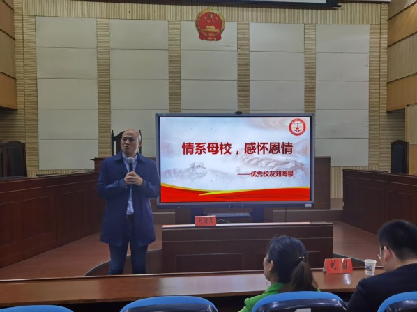 刘海泉以“情系母校,感怀恩情”为主题从三个方面分享他的感悟。一是感恩,回首青春多彩的老员工涯,面对母校日新月异的发展,刘海泉感慨万千,他感恩母校培育,也希望同学们热爱母校;二是目标,他结合自身的考研经历,勉励同学们立足当下、放眼未来,明确目标、刻苦奋斗;三是努力,他告诉同学们知识改变命运,学习成就未来,大学期间一定要发奋图强,不负青春好年华!