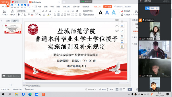 2022年10月5日晚7点,公司于公共教学楼B109和腾讯会议线上线上同时进行普通本科毕业生学士学位授予实施细则及补充规定讲解活动。公司学习部部长带领副部,面向22级新生以及转专业同学召开此次会议。