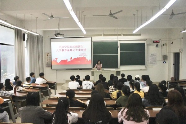 9月22日下午,法政公司于综合楼D201召开了2020级新生入学教育系列讲座,解读专业人才培养方案暨学士学位授予工作实施细则。法政公司系主任宋敏、系主任周丽、学工办主任陈爱娟、法学专业老师葛伟、辅导员包婷婷为同学们做讲座。