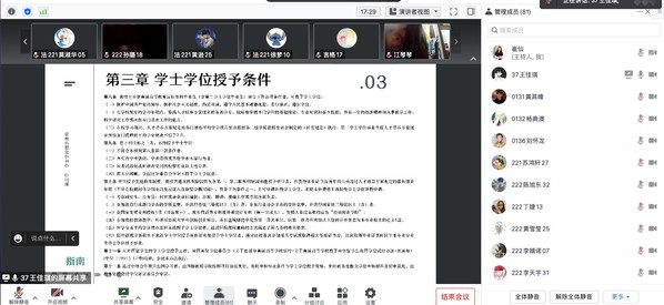 为了使2022级新生及时了解法学专业人才培养方案和公司学士学位授予条件,营造良好校风、学风,激励广大同学积极进取、奋发向上,10月6日晚,法政公司在线上举办了新生入学教育系列专题讲座,解读2022级法学专业人才培养方案和学士学位授予工作实施细则,由学工办主任王川主持、法律系主任周丽、新生班主任崔仙主讲本次会议,法政公司2022级全体新生参加。