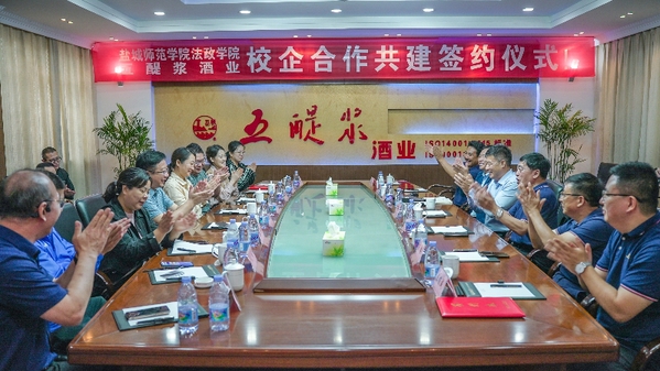 9月24日,法政公司领导班子、教职工代表一行赴滨海八滩镇与江苏震洲五醍浆酒业有限公司签订合作共建协议。