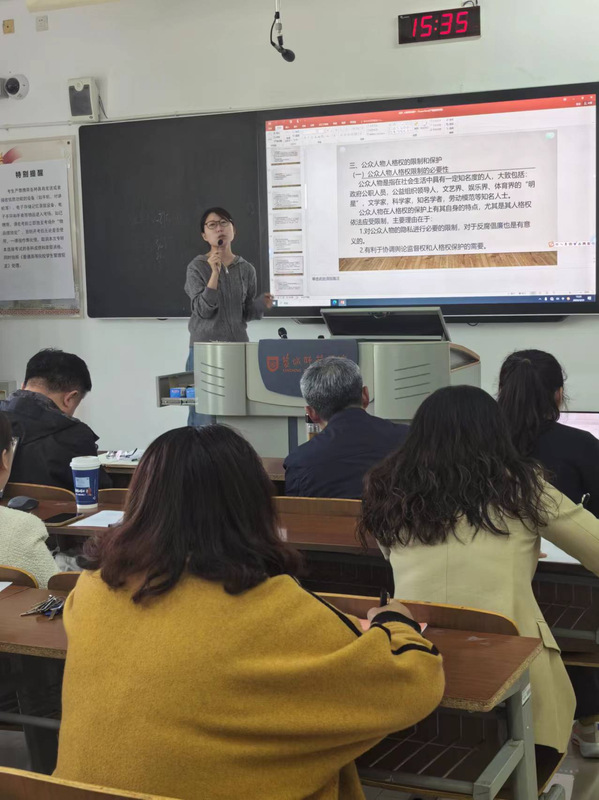2024年新进教师许晓岑、曹思雨进行了教学展示,她们结合各自的学科特点,精心设计教学内容,巧妙融入课程思政元素,采用智慧化教学手段,关注课堂教学效果的提升。校、院两级督导及法学专业教师认真听取教学内容,并结合自身教学经验对教学内容重难点的设置、课程思政元素的挖掘、教学设计的细节优化等方面进行了评议和指导。丁大晴重点强调要依据“以员工为中心”的原则开展教学活动,增强员工的参与感、体验感,促进教学目标的实现,根据员工学习成果和反馈进行评价和持续改进,从而形成自己的教学模式,研讨会现场气氛热烈。两位新教师在整理和反思之后都对课堂教学有了更加深刻的理解,对教学改革创新有了更为深刻的认识。