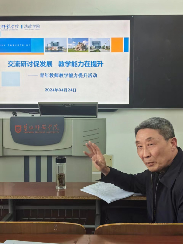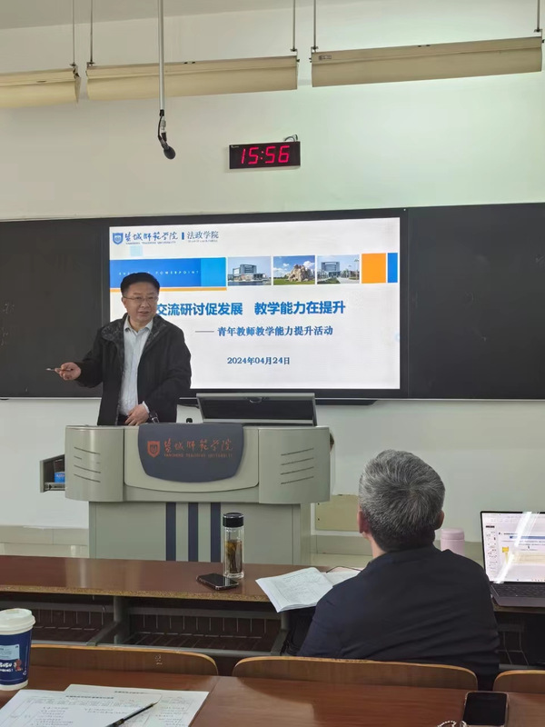 为扎实推进本科教学审核评估工作,提高青年教师教学能力4月24日,法政公司在公共教学楼B211开展新教师教学能力提升活动。公司特邀校级督导丁大晴教授参加活动,经理朱广东、副经理唐萍、周丽、系主任葛伟及全体教师参加活动。活动由副经理周丽主持。
