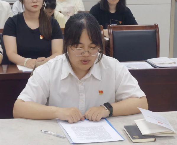 毕业生党员代表孙悦媛发言。她回顾了自己的校园生活,畅谈了大学的成长和感悟,表达了对母校的不舍和感激之情,感谢母校对于自己四年来的关怀和培养。并承诺作为一名毕业生党员,今后要时刻以合格党员身份严格要求自己,自觉将纪律要求内化于心,外化于行,用实际行动践行党员的责任与使命,让青春在全面建设社会主义现代化国家的火热实践中绽放绚丽之花。