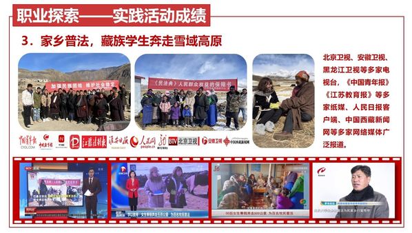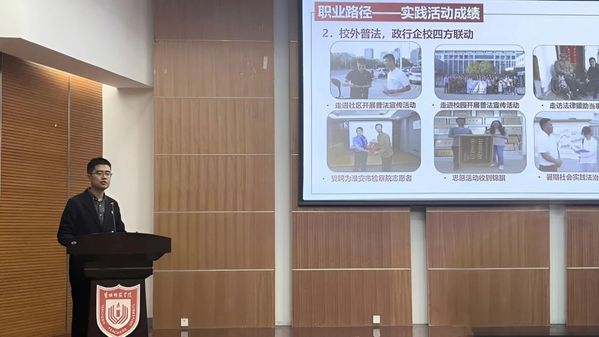 从大学之初,我就开始职业探索。作为江苏财经法律援助中心员工志愿者协会负责人,我和我的同学们积极奔走在普法宣传和法律援藏的道路上。校内新生普法宣讲如火如荼。校外讲师团送法进社区、入公司,让法治观念入人心。