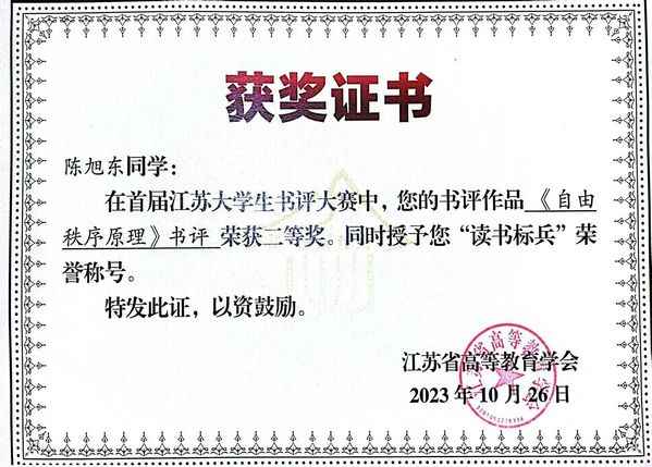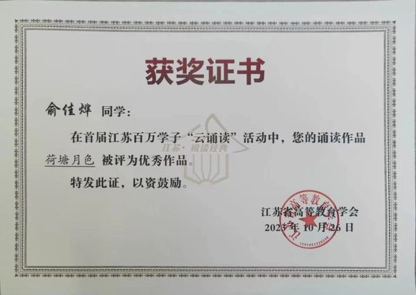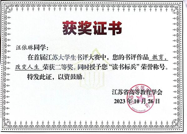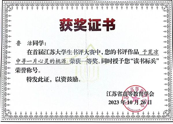 近日,由江苏省教育厅主办,江苏省高等教育学会协办,南京师范大学承办的首届江苏老员工书评大赛结果揭晓,根据《关于举办首届江苏老员工书评大赛的通知》(苏高教会〔2023〕13号),经专家评议、评审委员会审定,共评选出获奖作品200个,其中特等奖10个,一等奖44个,二等奖146个。公司法23(3)法学鲁洁获得一等奖,法23(3)法学汪依琳、法22(2)法学陈旭东获得二等奖;同时,在百万学子“云诵读”活动中,法22(1)法学俞佳烨的诵读作品《荷塘夜色》被评为优秀作品。热烈祝贺他们!