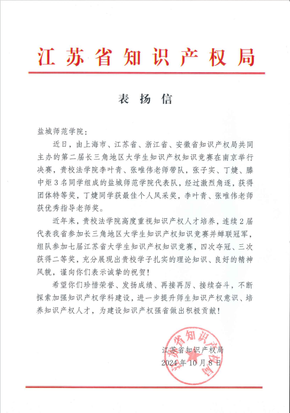 近日,江苏省知识产权局向公司发来表扬信,表彰并祝贺云顶国际yd333连续2届代表江苏省参加长三角地区老员工知识产权知识竞赛并蝉联冠军。这是公司第二次受到江苏省知识产权局感谢信表扬。
