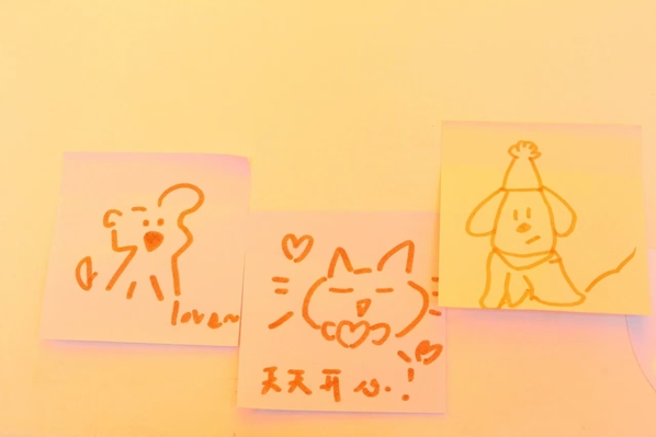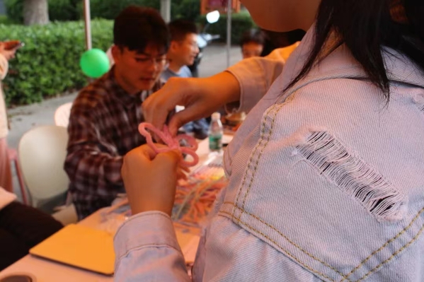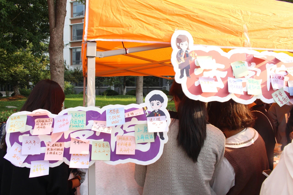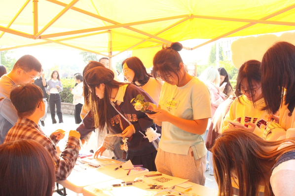 活动现场人头攒动,洋溢着无比热烈的氛围。五彩斑斓的便利贴像是情绪的画布,用色彩来诉说着不同的心情故事,而那些被精心折叠成花朵模样的扭扭棒,更是吸引了大批同学的目光,他们不由自主地停下脚步,翘首等待以体验活动的乐趣。