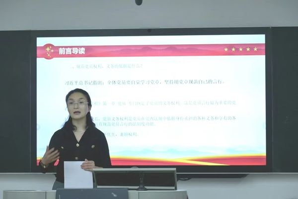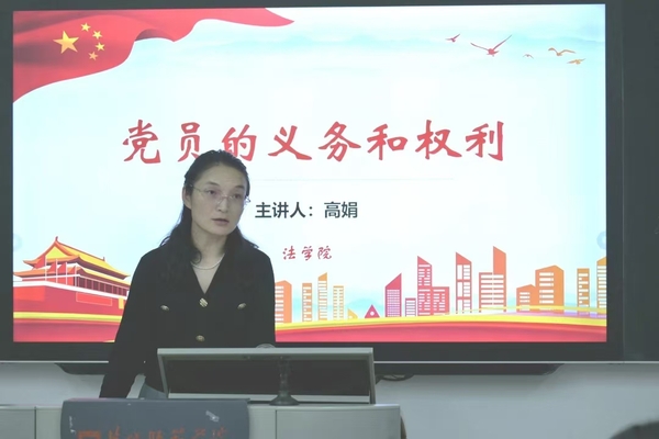 本次党课的主题是“中国共产党党员的权利和义务”。高娟首先指出依党章履行义务、行使权利的重要性。其次,她将中国共产党党章的发展分为四个阶段,详细地讲述了党员的权利义务发展和完善的过程。随后,她讲解了党员的八项义务和八项权利,以及如何正确履行义务、行使权利。最后,她希望入党积极分子们要履行好党的义务,行使好党赋予的权利,不断加强自身修养,提高政治觉悟,努力践行党的宗旨,为实现中华民族伟大复兴的中国梦贡献自己的力量。