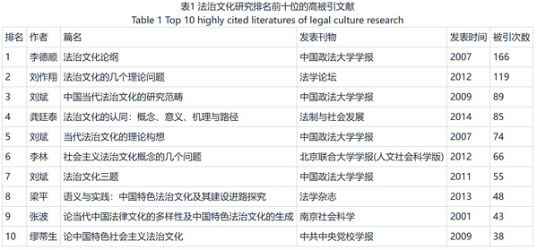 文献的被引次数较为客观地反映出该文献在某一研究领域的学术影响力和权威性。表1显示的是在法治文化研究领域排在前十位的高被引文献,其中中国政法大学终身教授、法治文化专业博士生导师李德顺教授发表在《中国政法大学学报》的《法治文化论纲》一文是本次统计分析数据中被引次数最多的文章,被引用次数达166次。总体来看,在法治文化研究领域,出现了一些很有影响力的作者以及高被引文献。但从整个研究领域的学者数量、发文质量及高被引文献发表时间等方面来看,亟需涌现更多有影响力的学术专家和学者,以便产出更多高质量文献,从而引领法治文化研究不断向前推进。