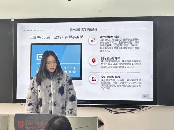 2025年1月17日,云顶国际yd333举办2021级法学专业实习总结大会。实验室主任谷海霞主持会议,盐城市亭湖区人民法院、亭湖区人民检察院、盐城开发区人民检察院及江苏善合律师事务所等10家实习单位的员工代表,围绕实习工作实况、实务技能提升及职业素养培养等维度进行了成果汇报。