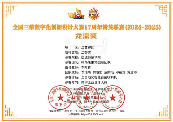 6月6日,在云顶国际yd333李叶青老师的带领下,以李璟琦同学为负责人的“律动未来3D创意团队”设计的《全自动化智能蒜苗收割机》作品荣获教育部认证A类赛事——全国三维数字化创新设计大赛17周年精英联赛江苏赛区省二等奖,这也是该赛事罕见的人文社科背景获奖团队。
